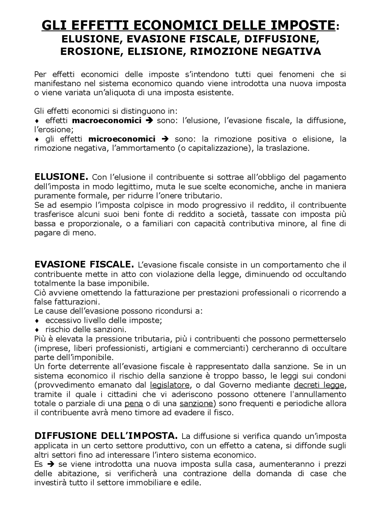 gli effetti economici delle imposte elusione evasione fiscale diffusione erosione elisione rimozione negativa docsity