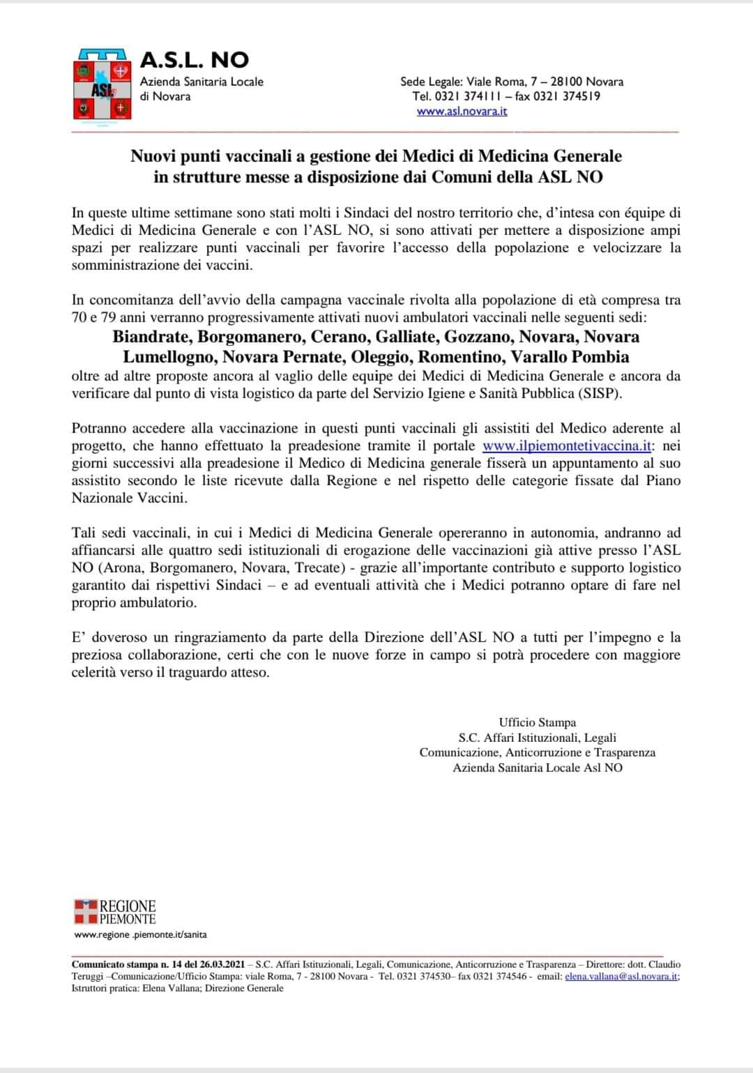 avvio centro vaccinale ad oleggio comune di bellinzago novarese